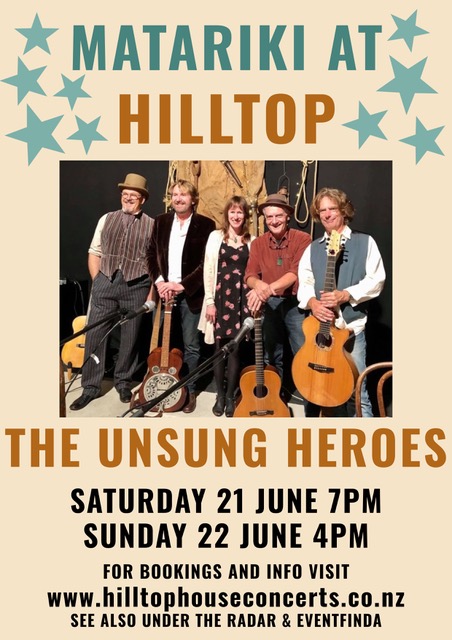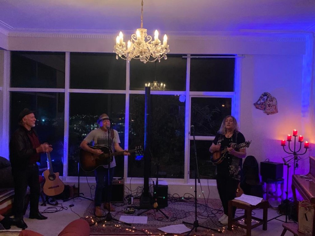 Such a fabulous night! Just wow! Great music, beautiful still night for the fireworks, delicious food thanks to Kit, wonderful people making the gorgeous vibe. Opened with Andy Kerr & Alan Norman; break for Vegetable hotpot (ratatouille) & rice, with 6.30pm Matariki Fireworks over the harbour; followed by the Rag Poets – Phil Hope, Vic Singe, Clinton Brown, Carl Evensen, and Alan Norman, with guest drummer Rob Clarkson. They play Americana/country roots flavoured music. They are a bunch of local musicians who have been on the Wellington scene for decades.