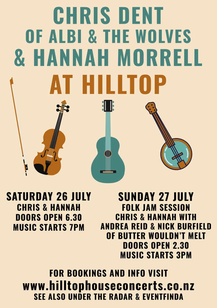 She’s a little bit quirky: He’s a little bit trad. This talented duo weave fiddle fireworks and lyrical guitar with silky vocals, to craft their arrangements for songs and tales that stir the blood and soothe the soul. “It’s so good to be making music for you once again. This time, in the lovely, intimate setting at Hilltop House Concerts in Kelburn, Wellington! We can’t wait. We have old songs, new songs and some downright quirky songs to sing and play for you. Songs of love, grief and glory. Songs with their own special tales to tell. Come on a journey to far-away places and far-out people! Come and find out about: revenge in the Carpathians; what are Infidel Skies; why is good tea so important; why you shouldn’t skate on rivers; and why Adam didn’t get the Apple and more, much, much more!”